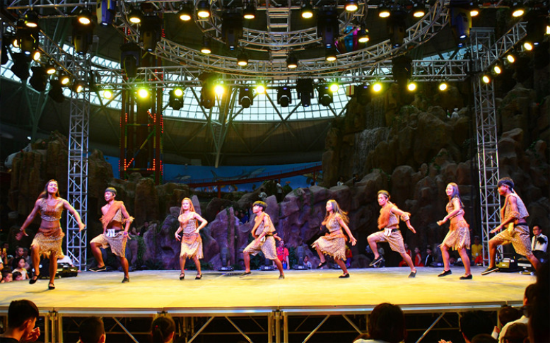 噴泉、火焰等多媒體技術,營造出有如人間仙境一般的畫面效果。展現秀水與奇花交相輝映的美麗畫卷。感受燈光變幻出五彩斑斕的