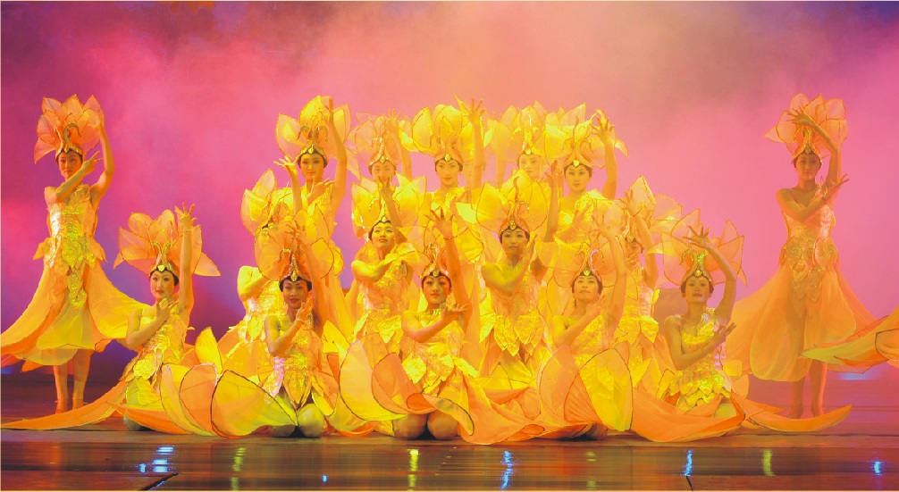 融入當(dāng)代的歌舞審美意識。通過"燈光染色"、"推拉平轉(zhuǎn)、升降懸空"等舞臺設(shè)施營造夢幻效果,通過