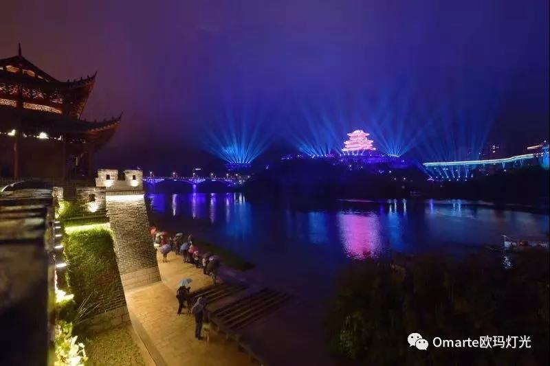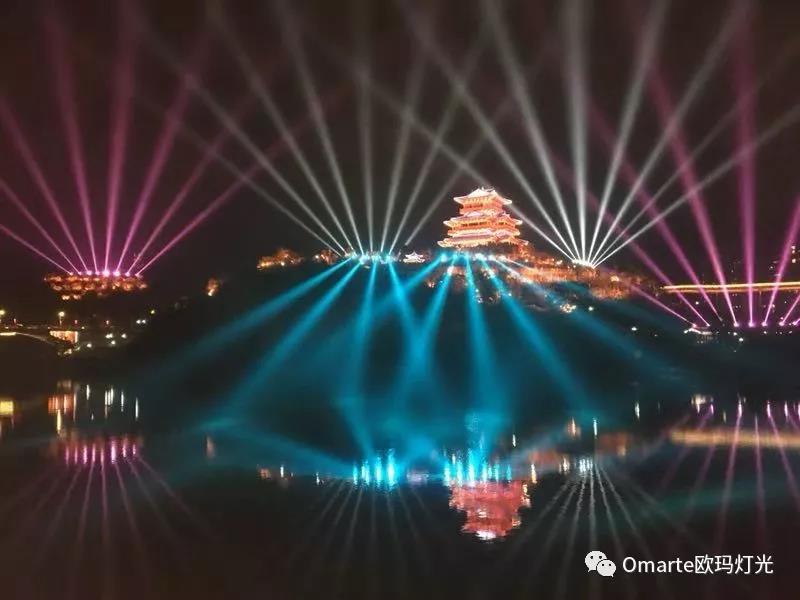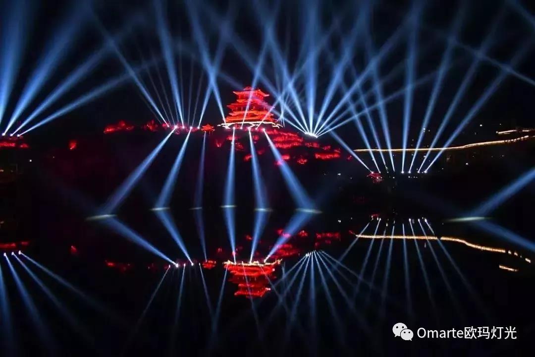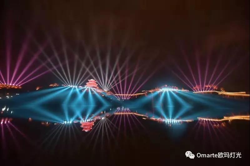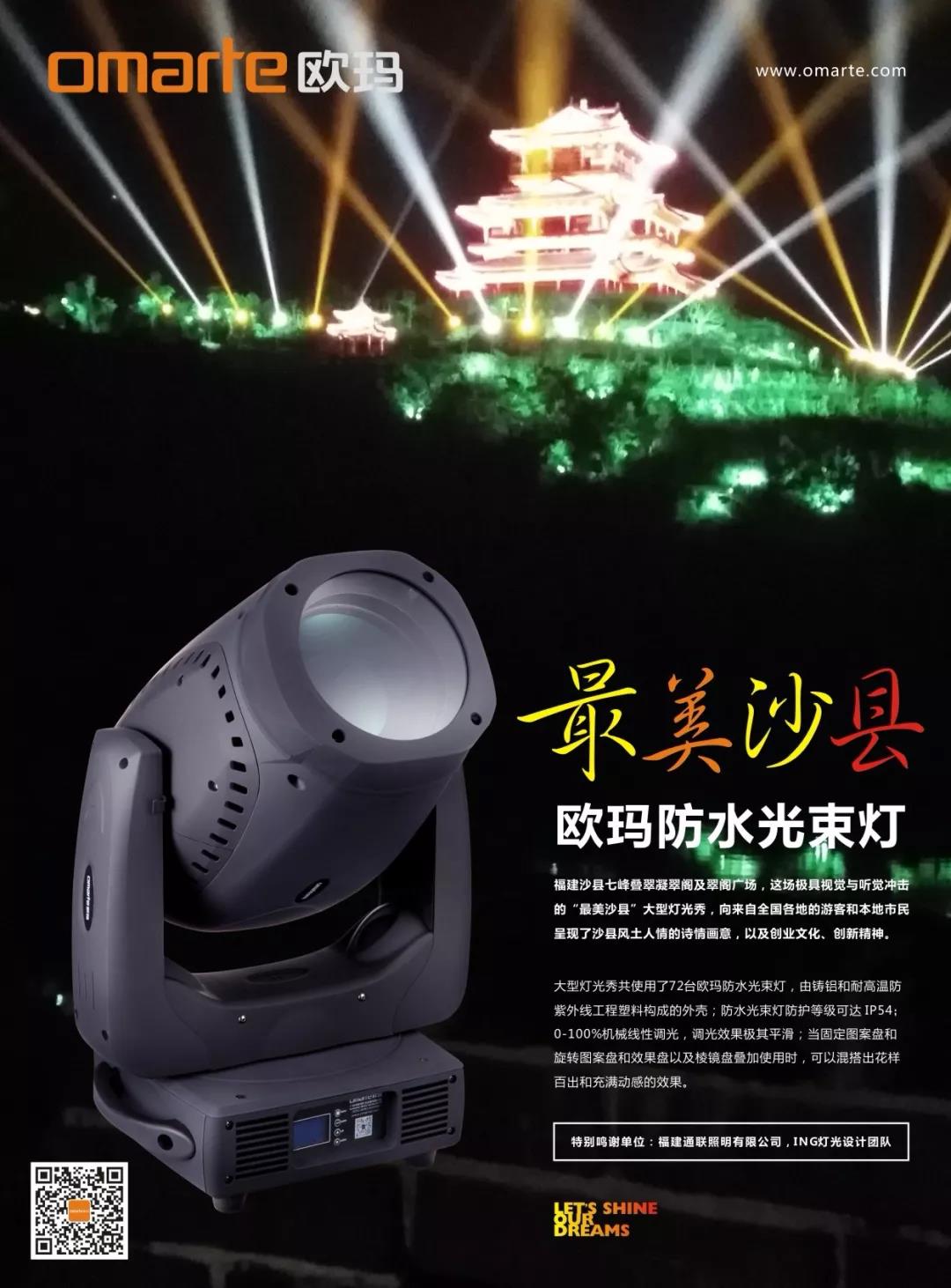 “最美沙縣”大型燈光秀共使用了72臺歐瑪防水光束燈,由鑄鋁和耐高溫防紫外線工程塑料構成的外殼;歐瑪防水光束燈防護等級可達IP54;0-100%機械線性調光,調光效果極其平滑;當固定圖案盤和旋轉圖案盤和效果盤以及棱鏡盤疊加使用時,可以混搭出花樣百出和充滿動感的效果。