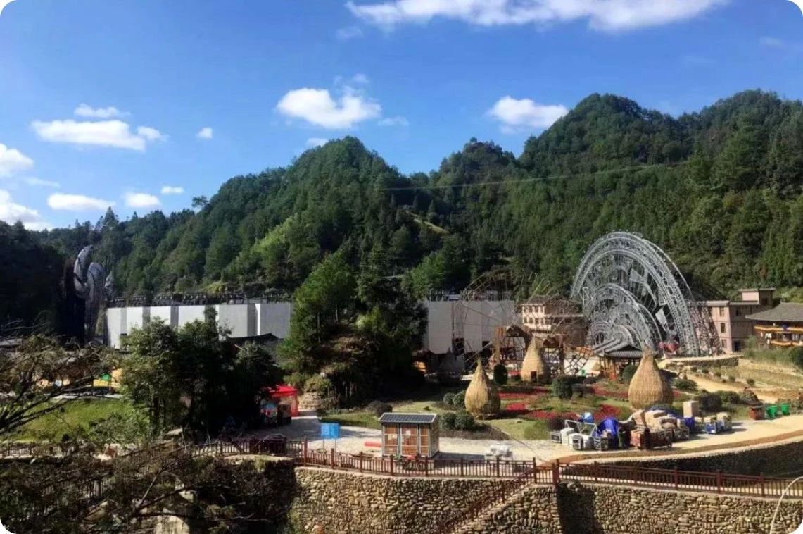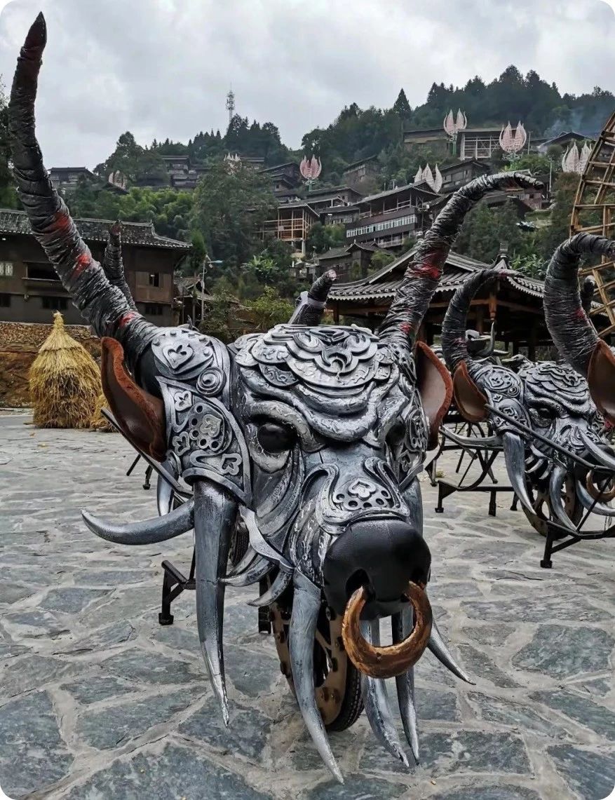 一部心史鑄魂魄,一曲長歌頌家園。《西江盛典》以山水實景苗族村落雞鳩苗寨為舞臺背景,以村民生產生活用品為舞臺道具,結合大塘景區的地貌山形,構成了舞臺劇場,真實再現了原生態。山體上,懸掛著的巨型牛頭;半山腰,一架紡織機,織出一條銀河之路散落山間;山腳下,聳立著壯觀的四面銅鼓群;村落中,遍布著25盞蓮花燈;清河邊的大水車旁,是有著600多年歷史的獨特建筑“水上糧倉”。