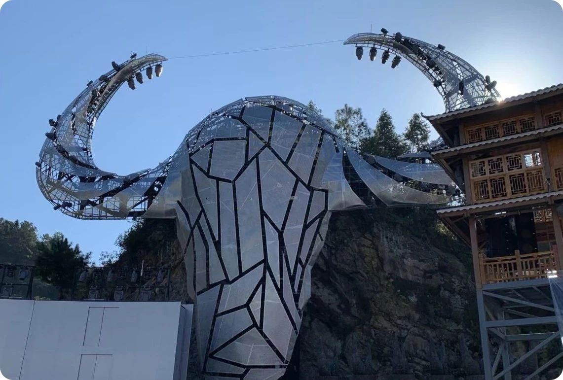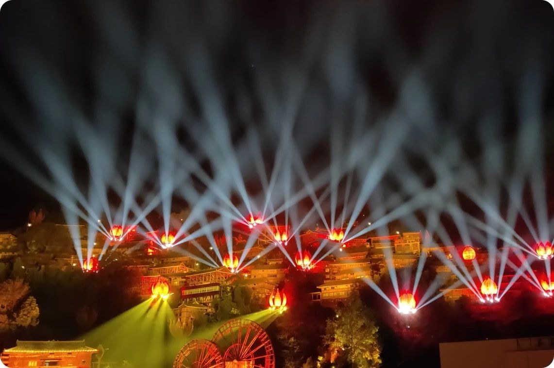 一首歌抒發一種情懷,一部戲還原一段歷史,整場演出燈光的處理正是將這種情懷、這段歷史傳遞給每一位觀眾,用光來訴說古老而神秘的苗族文化。《西江盛典》在占地面積9000平米的舞臺上, 360度移動裝置的觀眾席,能夠最大限度的讓觀眾觀看超過360度的演出內容,結合舞臺八塊景片環形幕、數千臺燈光、大型牛頭裝置、大型機械鐵花、苗族山水實景與升降舞臺演出,《西江盛典》震撼你的,不僅僅是演出,更是一場聲光電科技完美配合的視覺盛宴和厚重的苗族文化積淀。