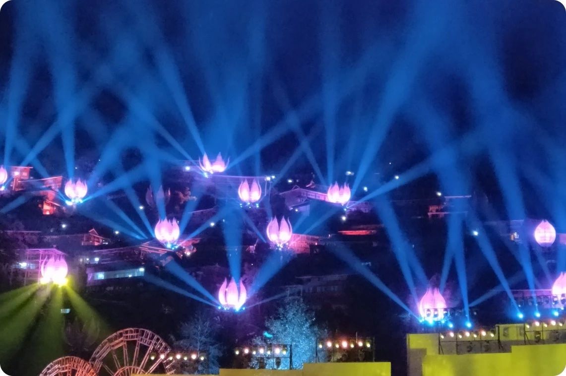 OMARTE歐瑪為《西江盛典》提供演出燈光設備和山體蓮花燈造型設計安裝。根據氣候特點和劇情需求,燈光總設計蒙秦老師采用了大量歐瑪LED光源戶外防水系列燈具,主要是: