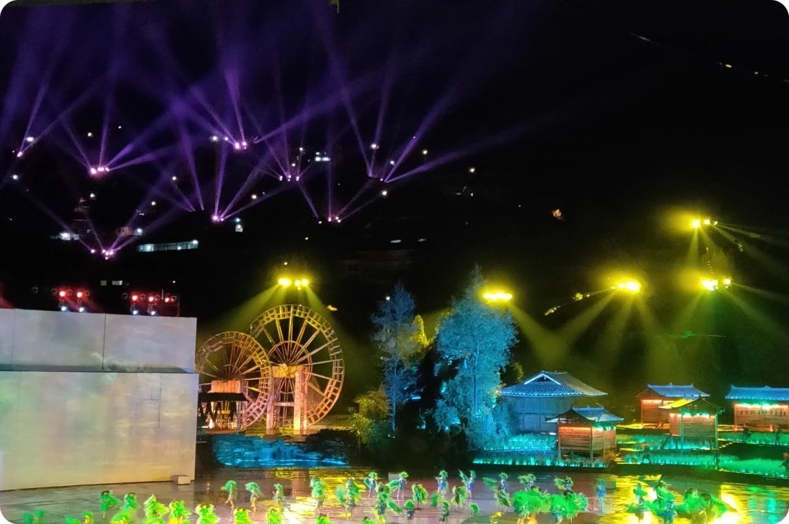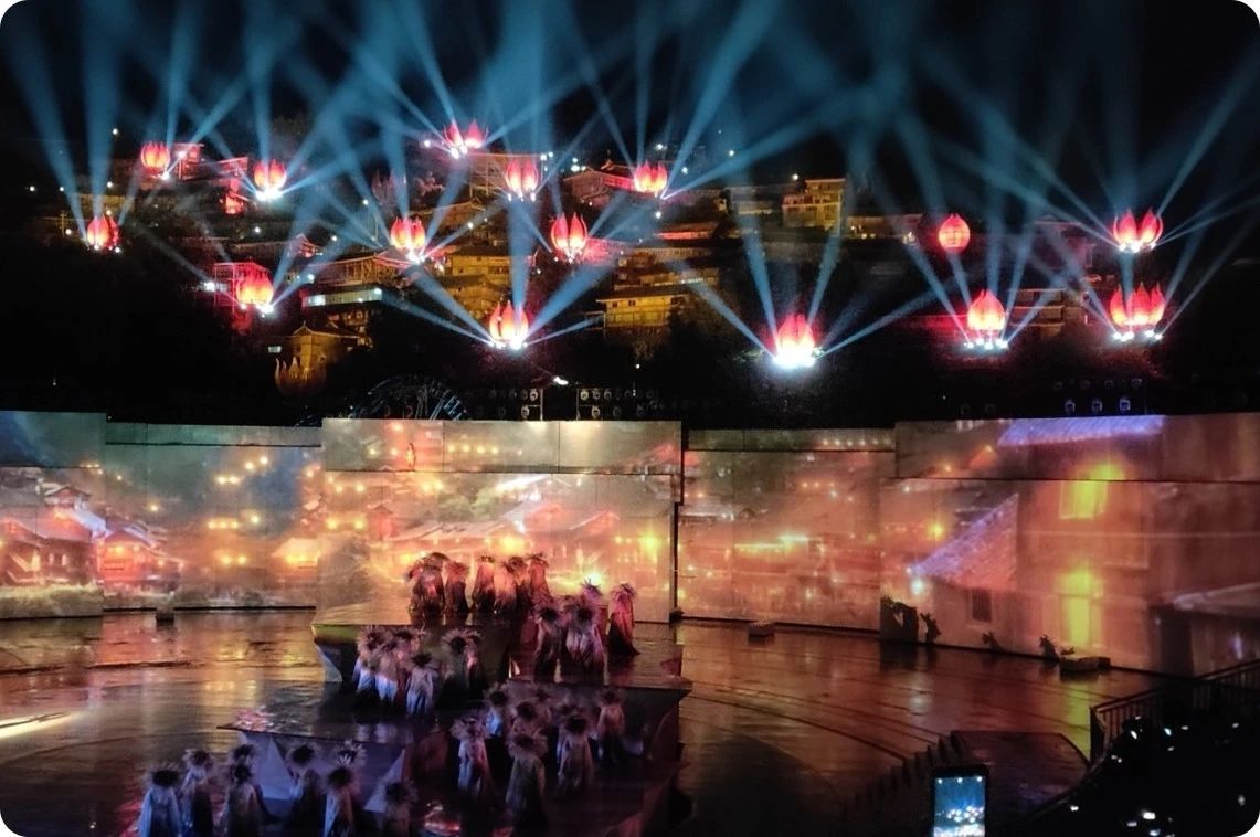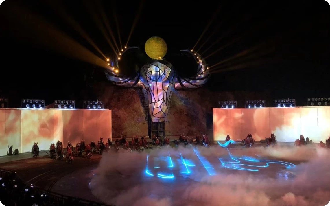 數千臺OMARTE歐瑪燈具綻放出無限絢麗的色彩,每個燈具的使用都經過了嚴格的測量和考慮,燈光的交錯排列豐富了舞臺的層次感,搭配卓越的舞臺特技、恢弘的音樂,多媒體等技術手段,藝術再現“序幕·頌、祖·英雄、魂·跋涉、夢·家園、尾聲·歌”五幕場景,詮釋了真摯而深重的苗族文化魅力,展示出一部苗族人民守護家園的氣勢磅礴的英雄史詩。
