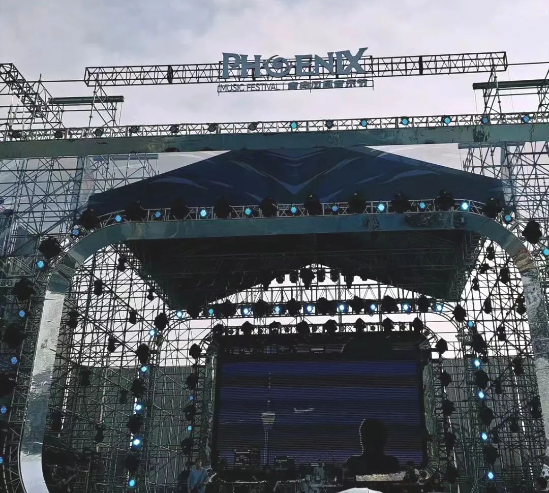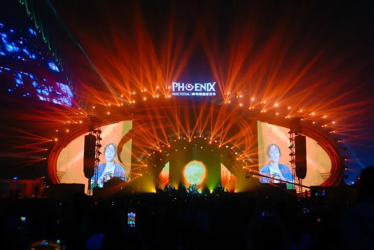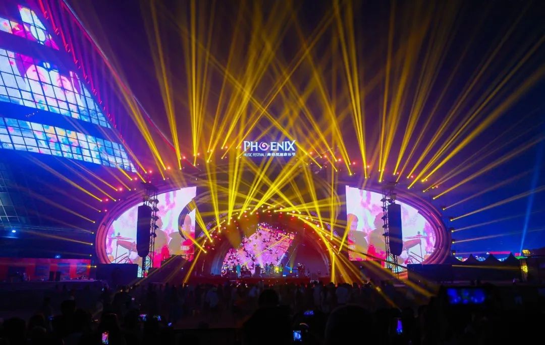 鳳凰音樂節夏日舞臺使用歐瑪LED切割燈、防水光束燈、搖頭染色燈、追光燈等200多臺設備。