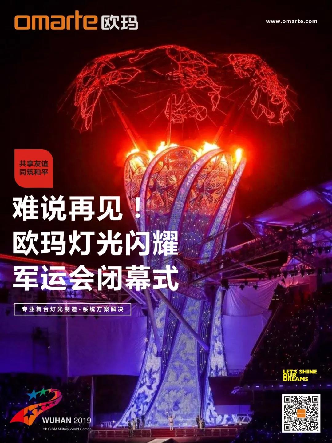 閉幕式的文藝表演晚會,歐瑪LED電腦切割燈(Ares-P7)和LED染色燈(Eos-B19)以其高亮度、低能耗華麗綻放于場館中心位置。追光燈(GATLING1500)更是身經百戰,以高穩定性聞名,一直以來深得客戶信賴。此次歐瑪燈光大力增色這場充滿活力的聯歡,讓現場的視覺效果依然磅礴大氣,依然最炫聲光電。