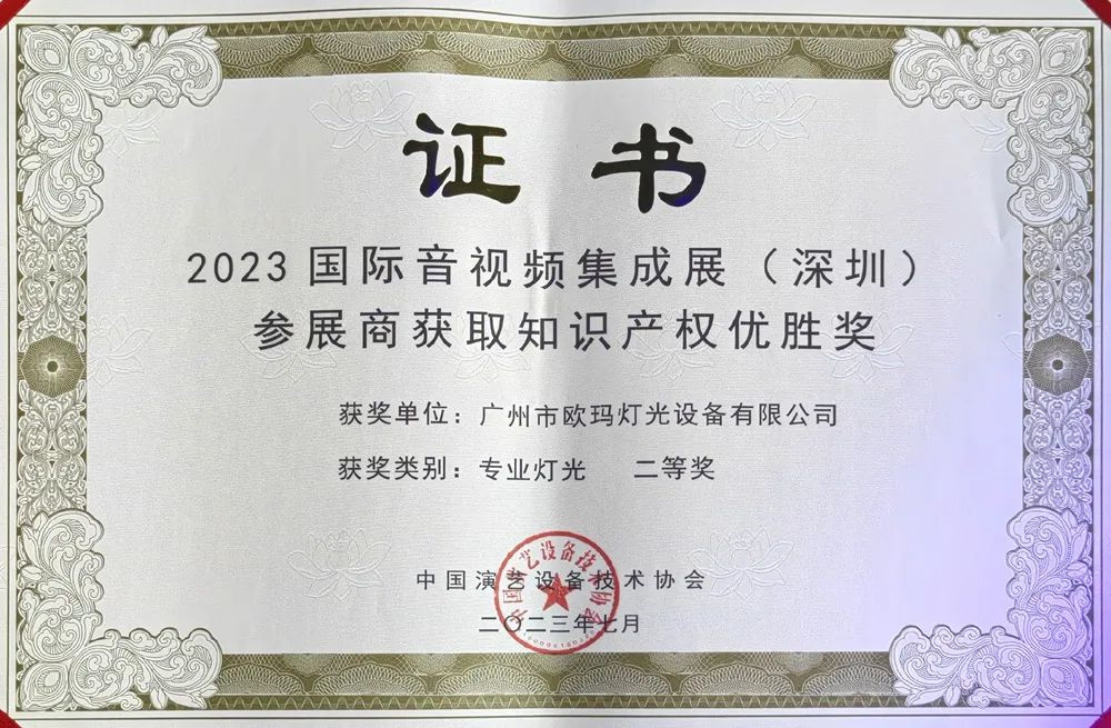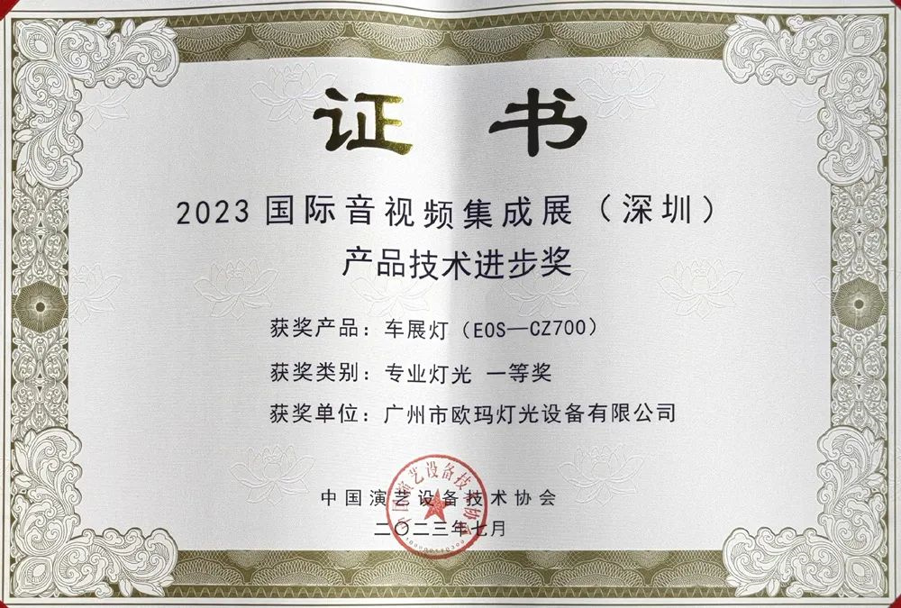 歐瑪燈光遠(yuǎn)程面光燈(GATLING 1400II)和車展燈(EOS-CZ700)評為“產(chǎn)品技術(shù)進(jìn)步獎--專業(yè)燈光一等獎”