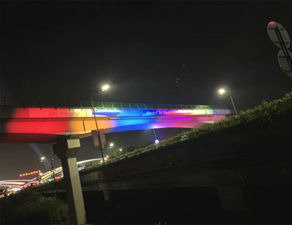 進出機場的道路,是各國政要和運動員去往亞運會場館和駐地的必經之地,也是城市形象的一次生動展示。18公里的機場快速路猶如一條蜿蜒的“巨龍”,展現著“省門第一路”新形象,機場公路全線高架及沿線兩側的亮化工程為迎接八方來客營造濃厚的亞運氛圍。以固定白光為主,開啟平時模式,點亮機場城市大道夜景。亞運會期間,將根據實際需求,開啟以紅韻紫、映日紅、月桂黃、水光藍、湖山綠五種動態燈光為主的亞運模式,突顯出城市夜景豐富的景觀層次。
