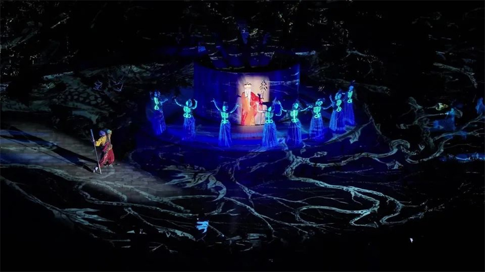 作為86版《西游記》片尾曲中師徒四人牽馬跋涉的取景地,陡坡塘瀑布承載著一代人的熒屏記憶。此次《再回西游》項目以瀑布為核心舞臺,依托山體、水幕、密林等自然景觀,結合全息投影、激光矩陣、霧森系統等前沿技術,將《西游記》中一系列經典片段逐一復刻。游客穿行于光影交織的山水之間,仿佛置身于神話與現實交錯的平行時空。