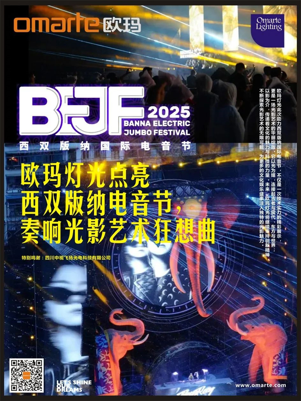 歐瑪燈光此次助力西雙版納國際電音節,不僅是一次技術實力的精彩展示,更是一場光影藝術的華麗綻放。它以光為媒,連接起古老與現代、東方與世界;以影為介,傳遞著文化的魅力與科技的力量。未來,歐瑪燈光將繼續秉持創新精神,不斷探索光影藝術的無限可能,為更多的文化娛樂盛事注入獨特的光影魅力。