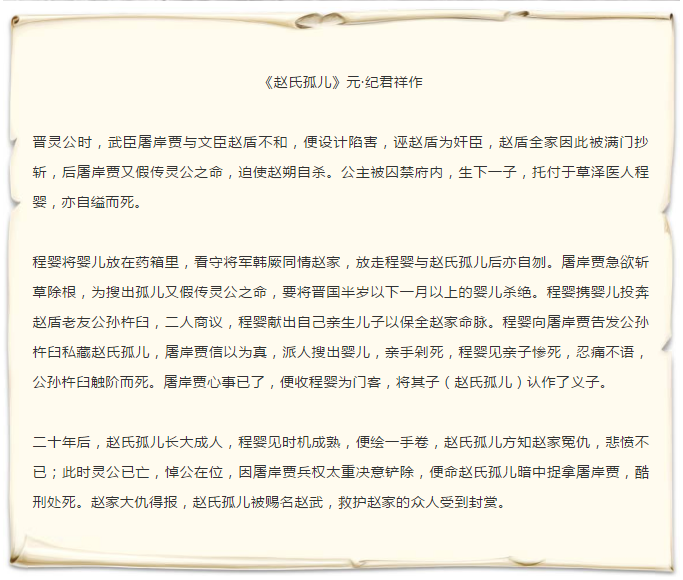 《趙氏孤兒》是中國四大古典悲劇之一,講敘春秋時期晉國貴族趙氏被奸臣陷害而慘遭滅門,幸存下來的趙氏孤兒趙武長大后為家族復仇的故事。該劇傳達了戰國時期所崇尚,也是我國傳統文化中重要內容的“義”,在劇中具體彰顯為與邪惡斗爭的人間正義。