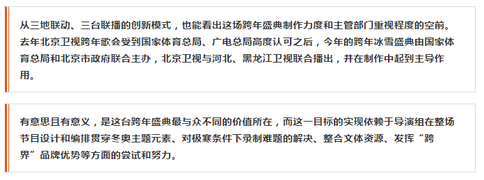 與一般跨年晚會不同的是,北京衛視2018環球跨年冰雪盛典特別設置了通過VCR與表演相結合的方式講述冬奧主題故事的環節。而且,晚會要放大呈現的就是冷與熱之間的反差,即便錄制環境是接近極限的寒冷,但晚會希望呈現出的是明星與觀眾共同狂歡迎接新年的熱烈氣氛,眾多歌手的表演都讓人熱血沸騰。