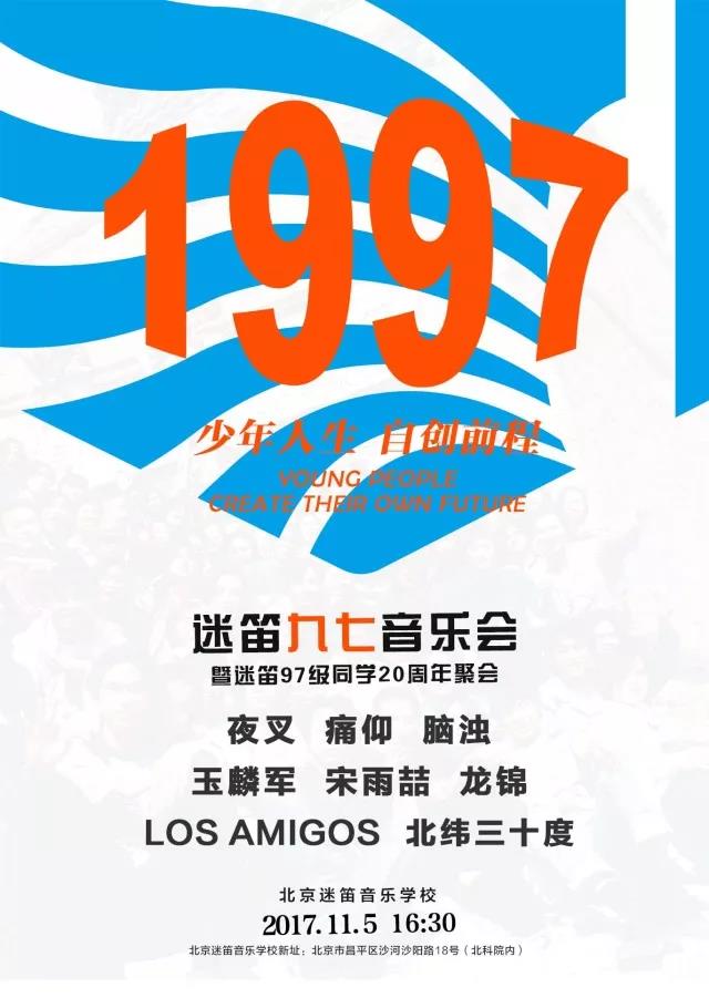 2017年11月5日,“迷笛97音樂會”在北京迷笛音樂學校新校址(北京昌平區沙陽路18號,北科院內)內舉辦,百位迷笛老朋友聚集在這里,為二十年后的重逢慶祝舉杯,上演一場陣容強大的音樂會。