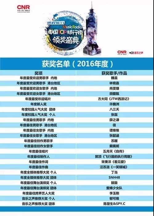 當晚,MusicRadio音樂之聲全國各地頻率對頒獎盛典進行了全程直播,優(yōu)酷音樂、來瘋直播也對本次盛典進行了全程視頻直播。隨著25項大獎花落各家、30組重磅明星精彩演出的依次呈現(xiàn),中央人民廣播電臺“2016年度MusicRadio中國TOP排行榜頒獎盛典”落下帷幕。