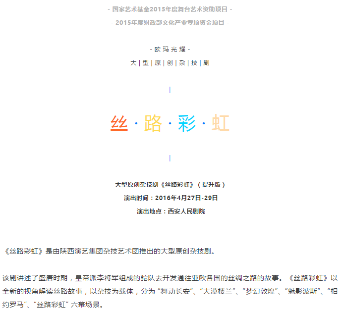 據介紹:該劇集中國 “新奇特難” 優秀雜技之大成,達到 “驚艷 + 驚險 + 驚喜” 的效果,將舞蹈、雜技、陜西元素、佛教文化、高科技等融為一體,采用舞臺高科技八分體升降旋轉臺、多媒體視頻、維亞、沙幕、1:1駱駝道具等,呈現出美輪美奐的舞臺效果。