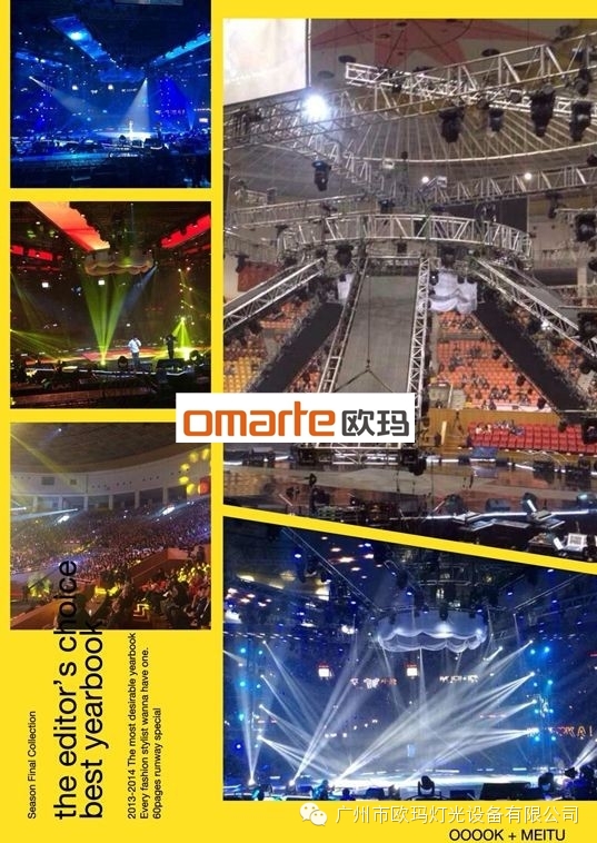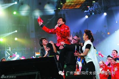 2014年4月6日晚,成龍“和平友愛演唱會”在北京三里屯北京工人體育館舉行,并有亞洲眾多嘉賓演出,此次演出設備均為歐瑪產品。包括新產品330W多功能電腦燈100臺,以及260W光束燈160臺,1500W光束燈60臺,1500W染色60臺,2000W追光燈8臺,LED搖頭燈40臺。給觀眾帶來一場震撼的視覺盛宴。