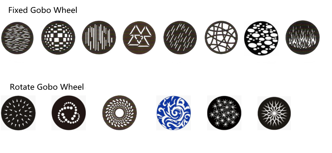1 rotating gobo wheel with 6 interchangeable gobos+blank; with the effect of positioning and shaking