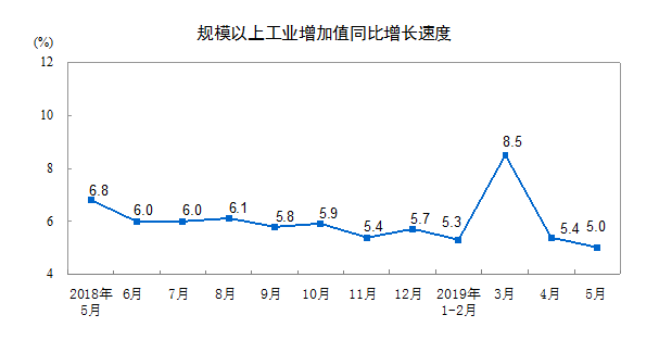 根據數據報告統計,2019年5月份規模以上工業增加值同比實際增長5.0%(以下增加值增速均為扣除價格因素的實際增長率),和上個月相比回落0.4個百分點。