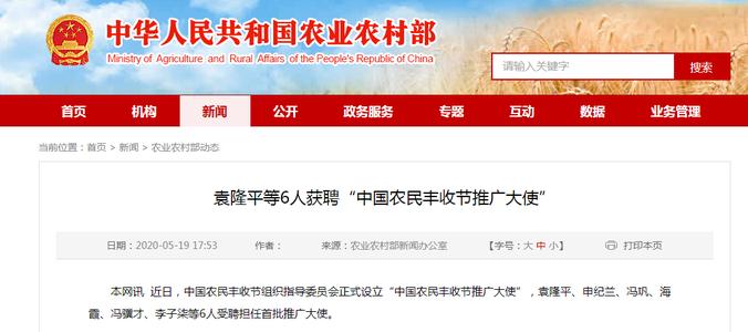 “中國農民豐收節宣傳大使”,袁隆平、申紀蘭、馮鞏、海霞、馮驥才、李子柒等被聘為首批推廣大使。