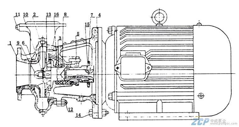 泵體(1)為鑄鐵制成,其內制有逐漸擴散至泵的吐出口成渦形的流道,出口法蘭上鉆有安裝壓力表的管螺孔。