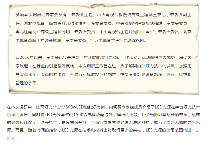 歐瑪燈光作為中國照明學(xué)會舞臺電影電視照明專業(yè)委員會委員單位,很榮幸參與此次調(diào)研活動。非常點贊這種調(diào)研模式,在加強(qiáng)企業(yè)和專家的近距離的溝通的同時,讓企業(yè)更好的把握產(chǎn)品開發(fā)方向,讓專家把關(guān)行業(yè)發(fā)展脈搏。祝本次調(diào)研活動取得巨大成功!