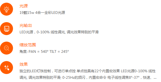 高效而出色的15w全彩4合一(RGBW)燈珠,能夠混合出你想要的無論什么顏色。LED光源驚人的20000小時壽命,在燈的整個壽命周期里面,都不用再為更換燈泡而煩惱。外置系統快速升級接口,可以一次性批量升級燈具系統。自帶獨有的隱藏式折疊燈鉤專利集成系統。帶有放大功能,能夠線性調節出光角。專利設計的無極旋轉系統,在整個放大的行程中,光學模組都可以進行無極限旋轉。19顆燈珠都可以單獨控制