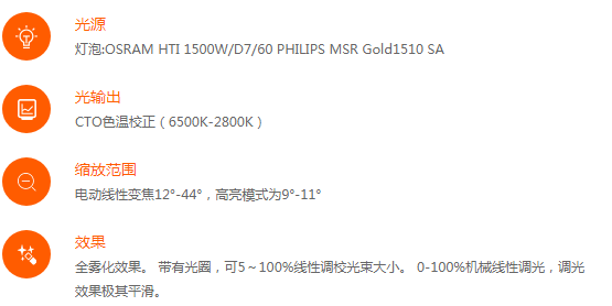 最新的OSRAM 1500w氣泡燈,顯色指數Ra>85。CMY+CTO混色系統能產生難以置信的高質量顏色變幻效果,2個帶有6種顏色片的顏色盤,可半色,可雙向變速流動。并且可以根據客戶需要來定制顏色片。外置系統快速升級接口,可以一次性批量升級燈具系統。自帶獨有的隱藏式折疊燈鉤專利集成系統。