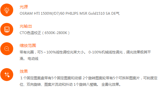 最新的OSRAM 1500w氣泡燈,顯色指數(shù)Ra>85。2個(gè)帶有5種可拆卸圖案片的旋轉(zhuǎn)圖案盤,5種固定圖案的固定圖案盤,6種顏色片的顏色盤。圖案加上顏色,再配合動(dòng)感效果,可以創(chuàng)造出動(dòng)態(tài)的投影效果。比如波光粼粼的水面,熊熊竄動(dòng)的火焰等。外置系統(tǒng)快速升級接口,可以一次性批量升級燈具系統(tǒng)。自帶獨(dú)有的隱藏式折疊燈鉤專利集成系統(tǒng)。獲得專利的散熱系統(tǒng),能很好的保護(hù)燈泡。