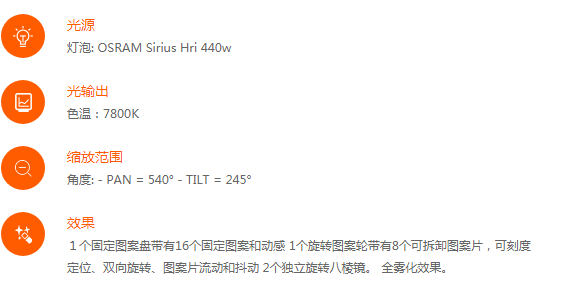 采用OSRAM 440w鉑金光源,超高亮度輸出,穿透力也超強。外置系統快速升級接口,可以一次性批量升級燈具系統。自帶獨有的隱藏式折疊燈鉤專利集成系統。有一個帶有14種色彩的顏色盤,色彩多樣選擇多樣。1個帶有16種圖案的固定圖案盤,1個帶有8種可拆卸圖案的旋轉圖案盤,可雙向變速旋轉。1個八棱鏡和1個十六棱鏡,雙棱鏡之間相互切換,配合旋轉圖案以及豐富的顏色,給人強烈的視覺沖擊。設計獨到的散熱系統讓燈具更強更穩定。