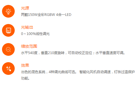 ·?燈珠:兩顆150W全彩RGBW 4合一LED
