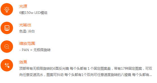 全新的6頭電腦燈采用了150w LED光源,與上一代6頭燈相比,產(chǎn)生的熱量更少。LED光源的壽命長(zhǎng)達(dá)驚人的20000小時(shí),再也不會(huì)為更換光源而感到煩惱。產(chǎn)生的熱量少,加上超長(zhǎng)壽命的LED光源,使整個(gè)燈具的穩(wěn)定性大大提高。獨(dú)有的隱藏式折疊燈鉤專利集成系統(tǒng)。外置系統(tǒng)快速升級(jí)接口,可以一次性批量升級(jí)燈具系統(tǒng)。每個(gè)頭都有1個(gè)帶有14種色片的顏色盤、和17種固定圖案的圖案盤。1個(gè)獨(dú)立的旋轉(zhuǎn)棱鏡。