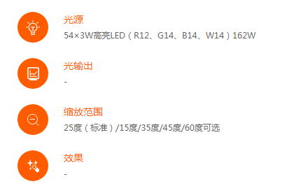 光源:54×3W高亮LED(R12、G14、B14、W14)162W