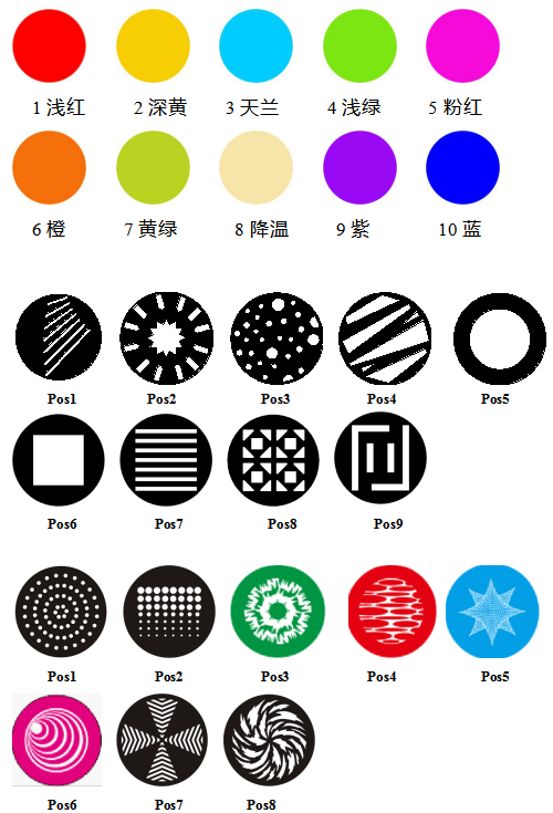 ·?2個圖案盤,其中一個帶有9個金屬圖案的固定圖案輪+白光;另一個是帶有可更換的4個玻璃圖案和4個金屬圖案的旋轉圖案盤+白光,有圖案定位、雙向旋轉、圖案流水和抖動效果。
