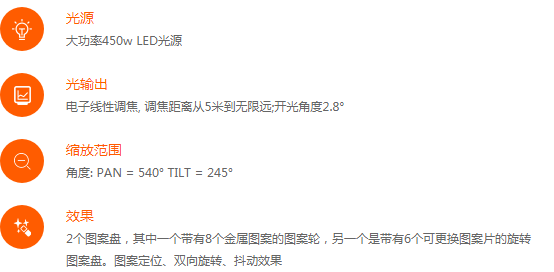 · 電子線性調焦, 調焦距離從5米到無限遠;開光角度2.8°,