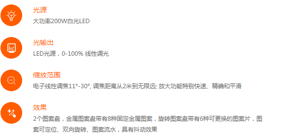 使用大功率200w LED光源的Ares S2,光源有驚人的20000小時壽命,在燈的整個壽命周期里面,都不用再為更換燈泡而煩惱。外置系統快速升級接口,可以一次性批量升級燈具系統。自帶獨有的隱藏式折疊燈鉤專利集成系統。能夠產生強烈的光束效果。全線性變焦范圍:11°-30°,燈具帶有2個包含7種顏色片的色盤,1個帶有8種金屬圖案的固定圖案盤,1個帶有6種可定制,并可拆卸的旋轉圖案盤。光斑特別的均勻