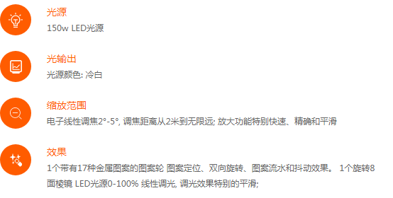 150w 冷白光源,配合定制的光學(xué),能產(chǎn)生超強(qiáng)沖擊力的光束。驚人的20000小時(shí)壽命,燈的整個(gè)生命周期里,都不用再為更換燈泡而煩惱。外置系統(tǒng)快速升級(jí)接口,可以一次性批量升級(jí)燈具系統(tǒng)。自帶獨(dú)有的隱藏式折疊燈鉤專利集成系統(tǒng)。11種顏色片、17種金屬圖案和一個(gè)8面棱鏡。并且光斑特別的均勻,不管是半空中的光束還是投影在地面的圖案,效果都非常的棒。