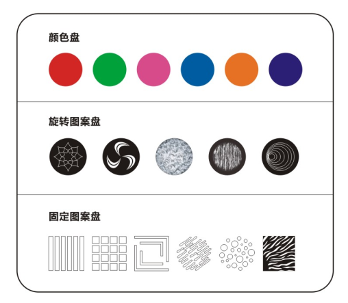 ·?2個旋轉(zhuǎn)圖案盤:各有5個插拔式的旋轉(zhuǎn)圖案片+空白;帶圖案抖動和任意定位功能