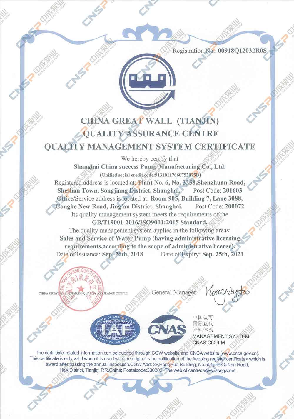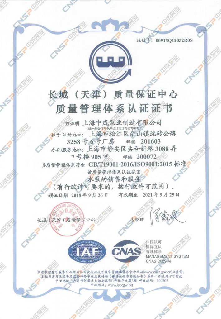 中成泵業作為一家獨立成熟完整的企業,以自吸泵為主打系列,經過長城質量保證中心各位專家的審核,滿足GB/T19001:2015質量管理體系標準要求,于2018年9月26日頒發證書。