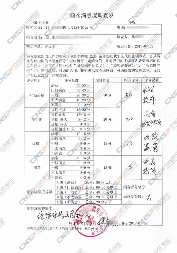 中成泵業從我們的多級泵、計量泵等產品的客戶中抽選幾名進行表格內容調查,客戶反饋成績均為A級,其中螺桿泵、磁力泵、隔膜泵等客戶紛紛表示希望保持合作并對我們的產品持有期望。