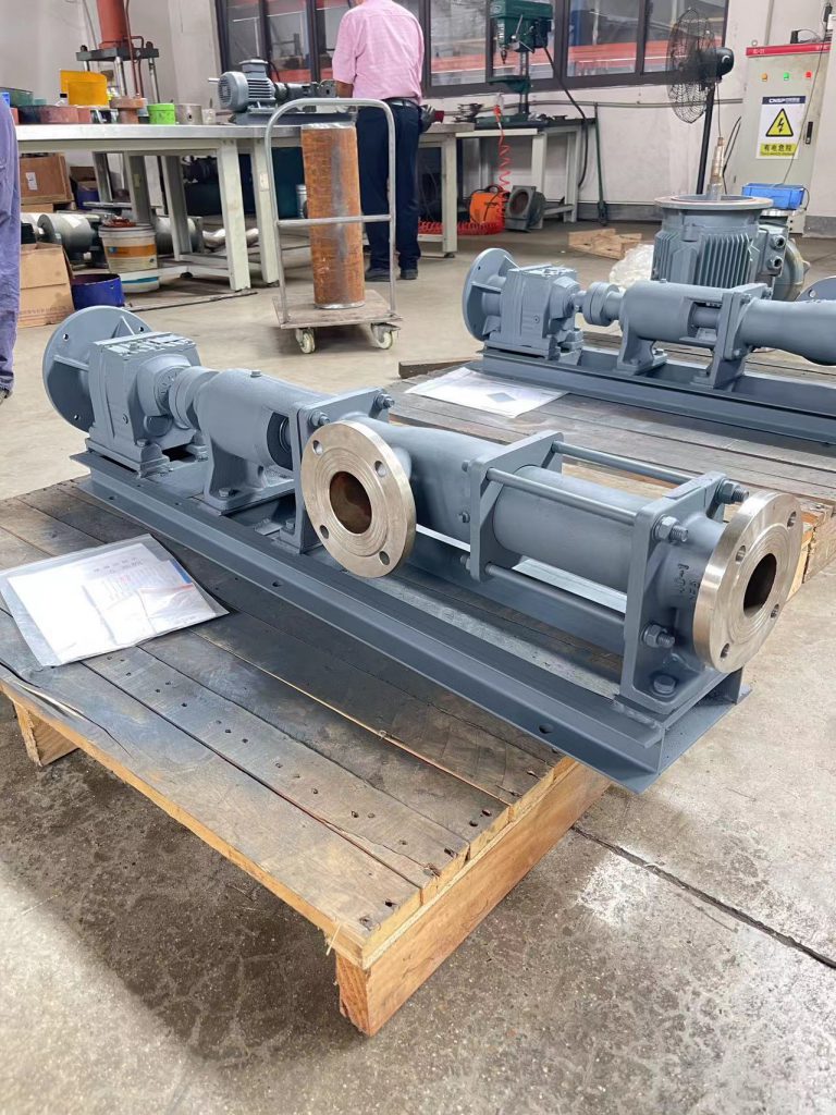 河北某環保科技有限公司是一家以水處理、環保節能技術和裝備為核心集研發設計、施工制造、環保設施運營、技術服務于一體的高科技企業。近期在我廠采購單螺桿泵,型號為G50-2,泵為鑄鐵材質,用于輸送污泥,已檢驗完工待裝箱發貨。